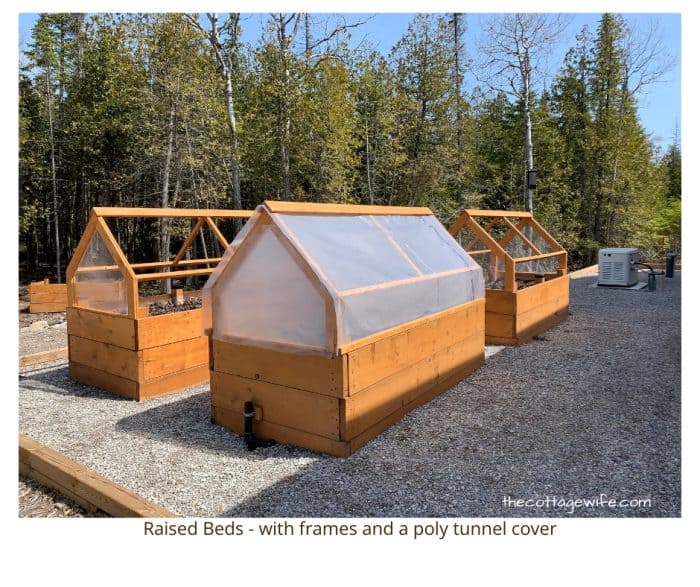 In an effort to control the pest damage – and to hopefully get a jump start on the season – Brian built permanent frames for three of our now four raised beds. As a trial, we covered one with poly (leftover vapour barrier from the garage build, because frugal is our middle name).