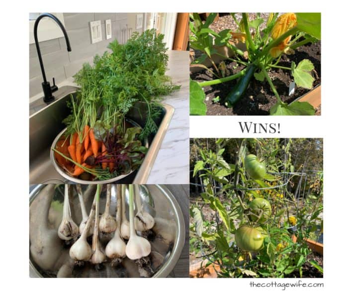 Two spindly plants out of four seeds looked like they wouldn’t make it, but somehow they pushed out six lovely zucchinis. That’s one cake, a couple stir-fries, and some roasted to top a salad. Not a bumper crop, but still a win compared to last year’s zero.
